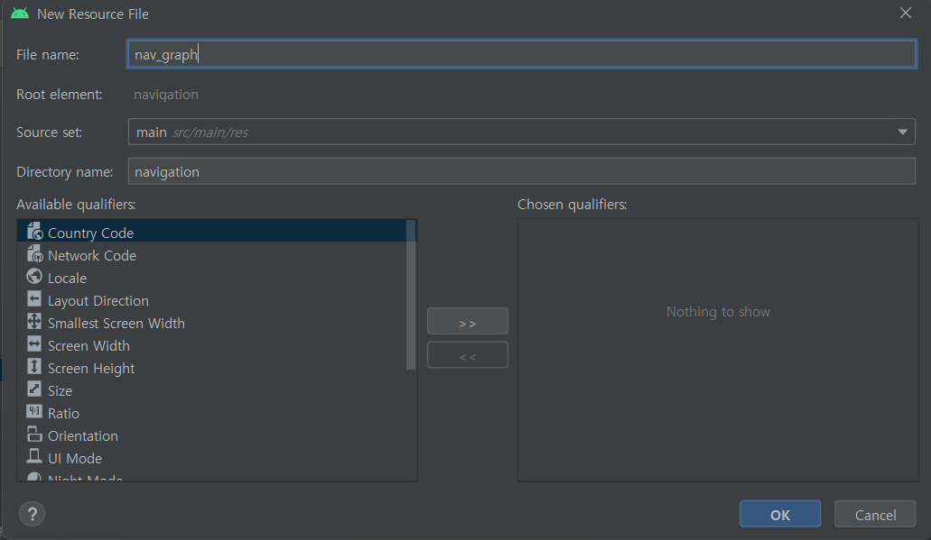 navigation 디렉토리에 New Resource File을 하여 nav_graph 파일을 생성해준다.