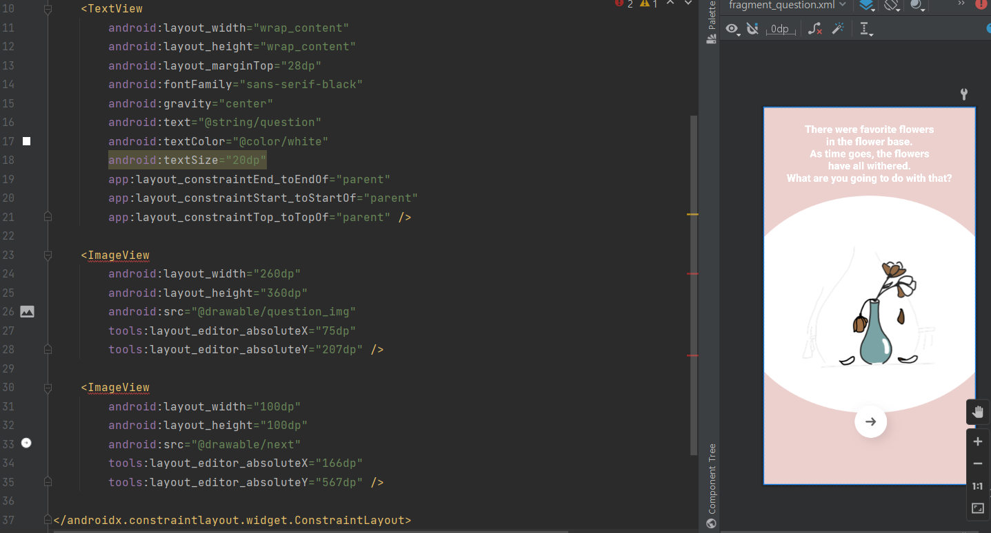 TextView를 통해 글자, 글자 크기, 글자 색상, 글자 속성, 글자 위치를 설정해줬다.