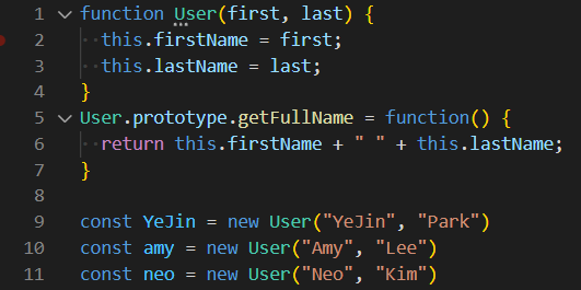 firstName과 lastName 부분은 인스턴스를 생성할 때마다 다른 내용이 들어올 수 있기 때문에 통일해서 메모리를 관리하기 어렵다. 그러나 getFullName 부분은 통일해서 메모리를 효율적으로 관리할 수 있다.