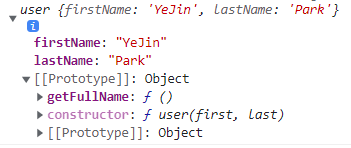 콘솔창을 보면 firstName과 lastName을 제외하고 prototype이 object인 것을 확인할 수 있다. user 함수에 숨어있는 prototype 속성 부분에 getFullName을 할당해줌으로써 몇 개의 인스턴스를 생성하더라도 메모리에 딱 한 번만 만들어진다. 그러므로 getFullName을 생성이 아닌 참조하는 것이다.
