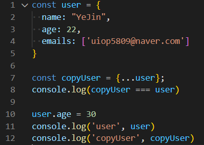 새로운 참조형 데이터인 user.emails 배열 데이터는 같은 메모리 주소를 공유하고 있다.