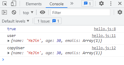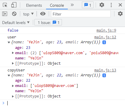 내부에 참조형 데이터가 있다면 복사되지 않는 것을 볼 수 있다.