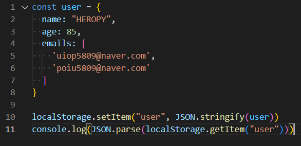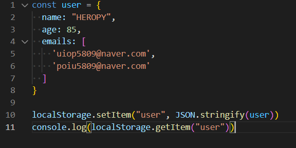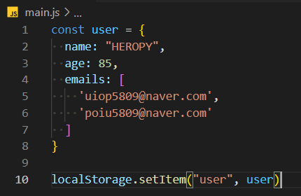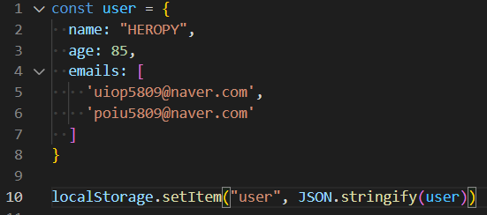 JSON 객체의 stringify 메서드를 사용하면 localStorage에서 보기 좋은 형태의 데이터로 넣을 수 있다.
