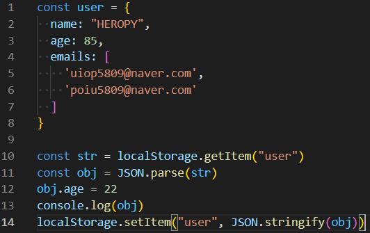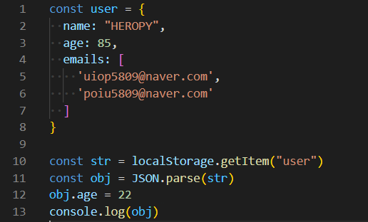객체의 속성을 바꾸고 싶다면 getItem으로 localStorage에 있는 객체를 가져온다.