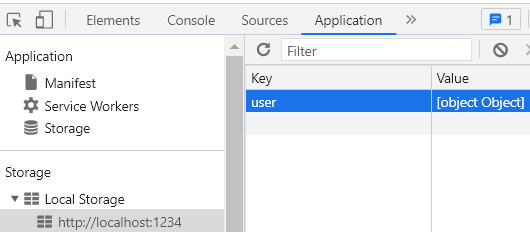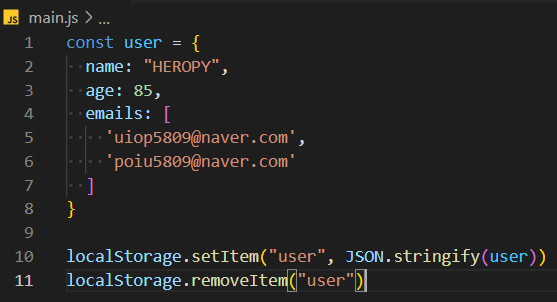 user라는 객체를 삽입했지만 removeItem으로 localStorage에선 삭제된 것을 볼 수 있다.