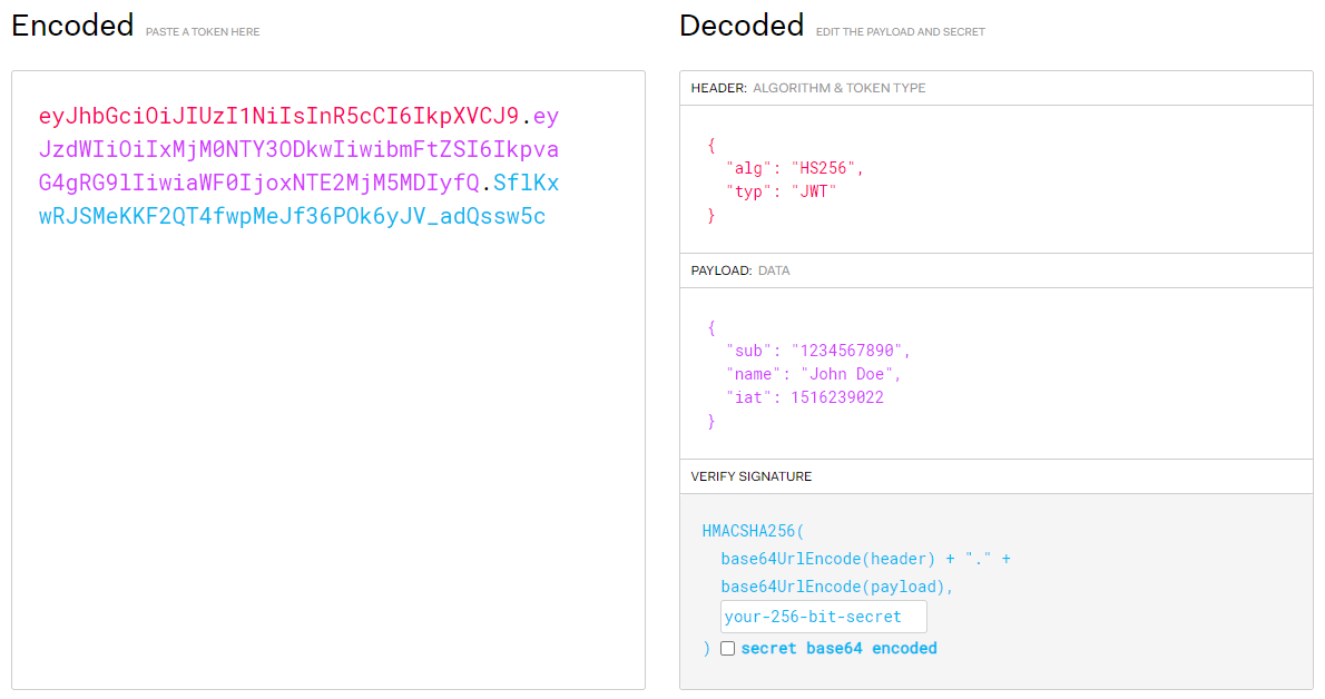 JWT 공식 사이트에 들어가면 암호화된 토큰을 볼 수 있다. 위에 사진을 보면 토큰이 세 가지 색깔로 구분이 되어있다. 자세히 보면 빨강, 분홍, 하늘 색깔 사이에 온점이 있는데, 이 온점이 바로 토큰을 구성하는 세 가지 요소를 구분하는 기준이다.