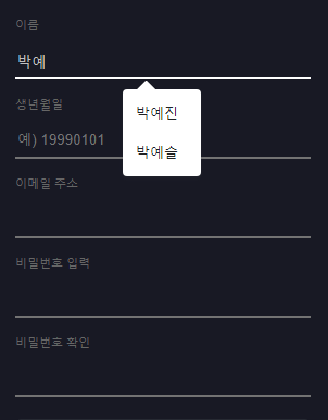 자동완성 시 스타일링은 CSS로 제어가 가능한데 :autofill을 사용해 제어한다.