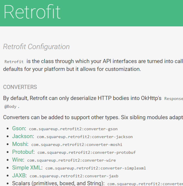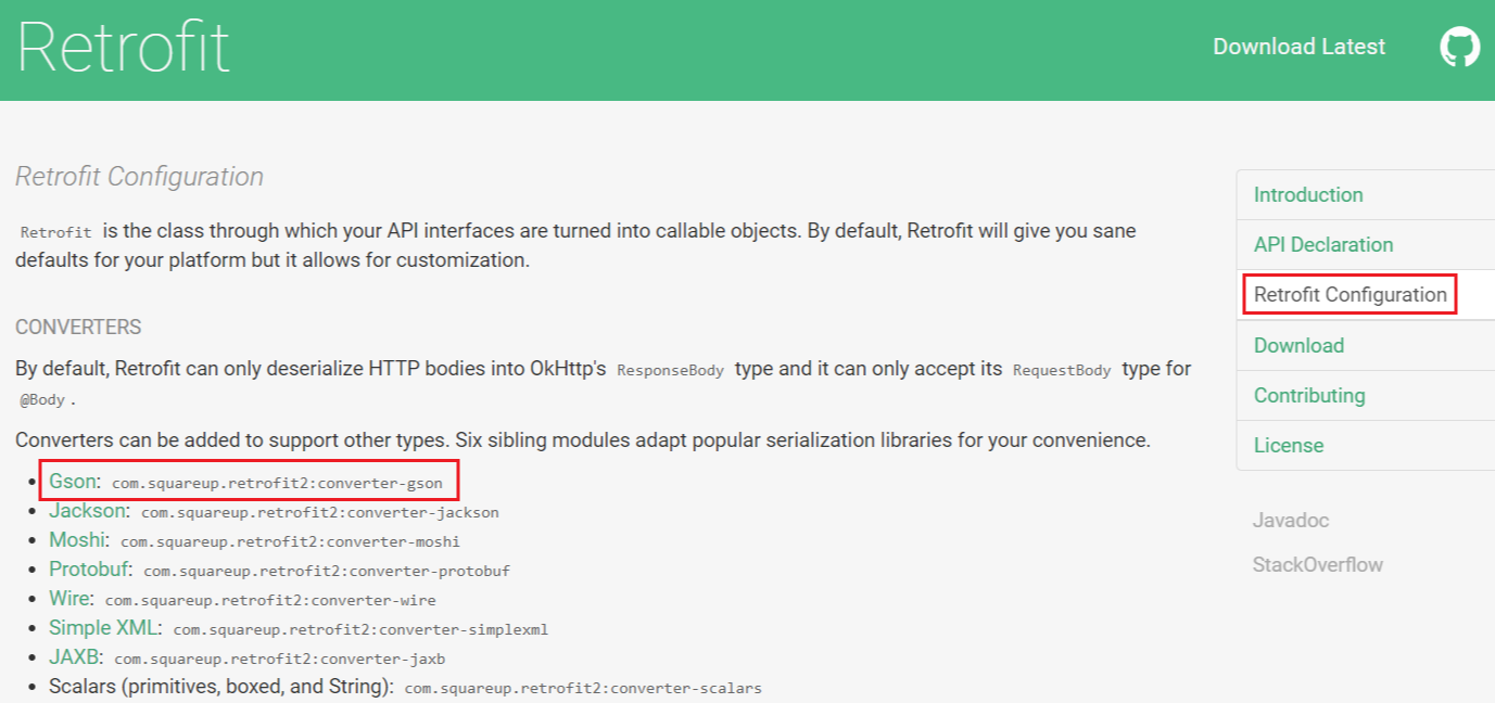 사이트에 들어가면 Retrofit Configuration에 코드가 있으며 아까와 같은 버전으로 설치해준다.