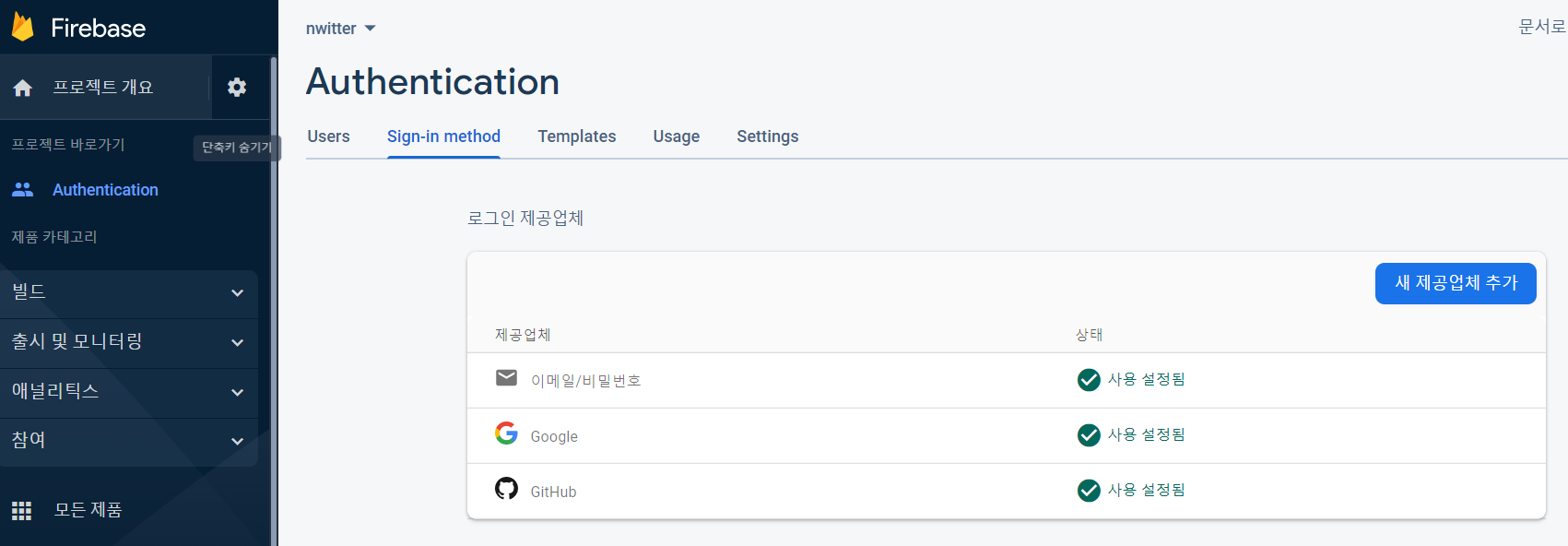 프로젝트 폼을 통해 새로운 계정을 만드니 firebase 홈페이지에 계정이 생성된 것을 볼 수 있다.