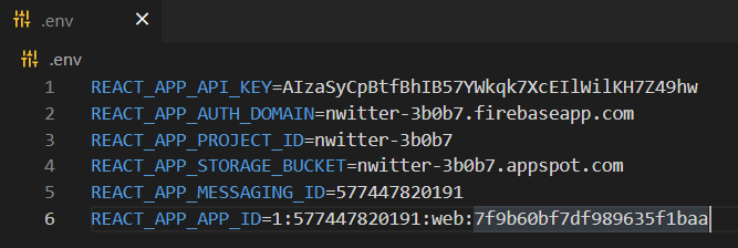 .env 파일은 firebase.js 파일 안에 있는 값을 보안을 위해 키값 그대로가 아닌 다른 값으로 치환시키기 위해 존재하며, github 같은 공용 웹사이트에 코드를 올릴 때 개인정보 보호 겸 사용된다.