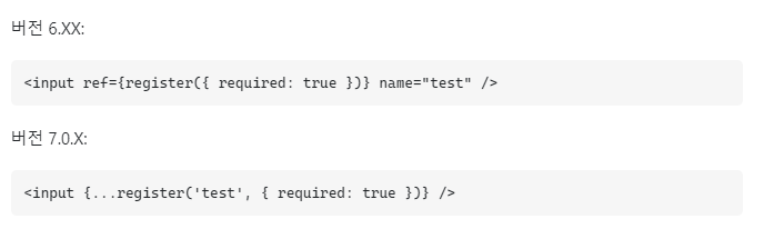 react-hook-form이 6.XX에서 7.0.0으로 업데이트되어 ref={register} 대신 {...register}을 사용해야 한다고 스택오버플로우에 답변이 달려있었다.