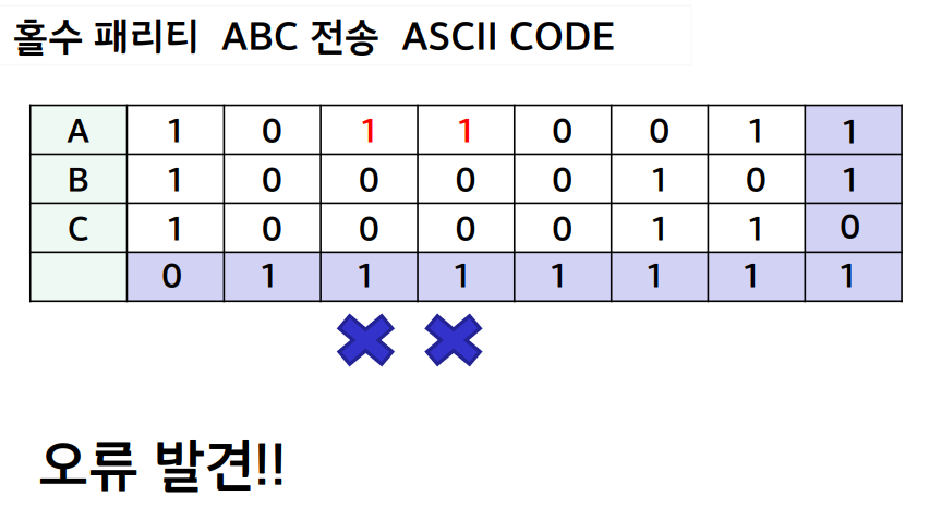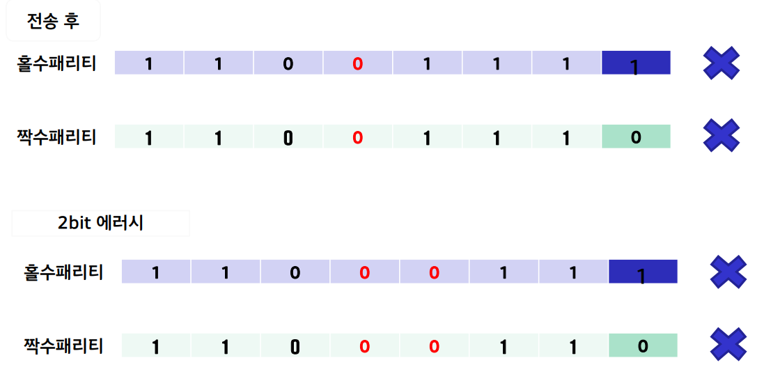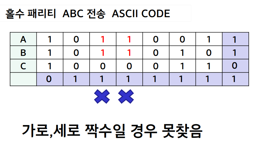 ex) 2비트의 데이터가 깨지면 1의 개수는 원래의 데이터와 같은 짝수나 홀수를 유지함