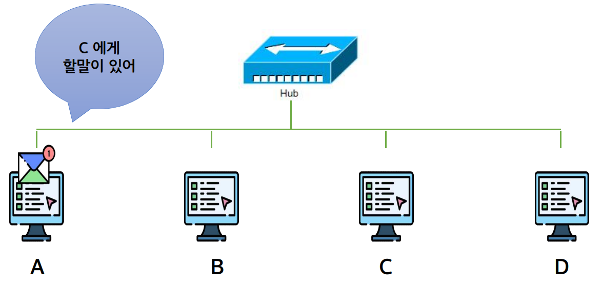 브로드캐스트: 임의의 호스트에서 전송한 프레임을 허브에 연결된 모든 호스트에 전달