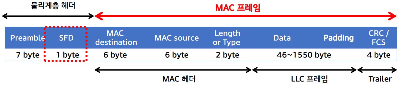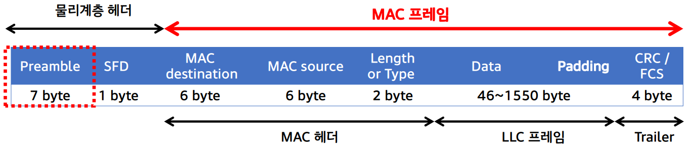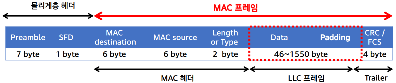 최소 프레임 길이: 64 바이트 (MAC 헤더 14 + 데이터 46 + FCS 4)
