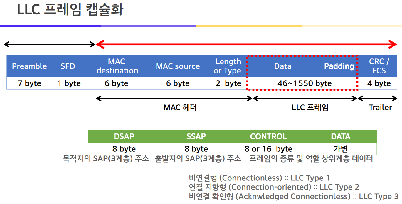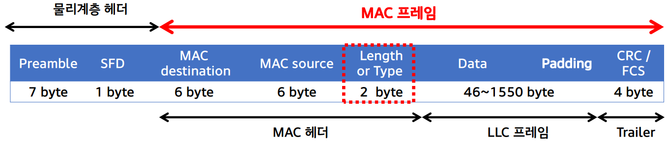 프레임 Length: 데이터 필드의 길이, 수납되는 LLC 프레임 길이