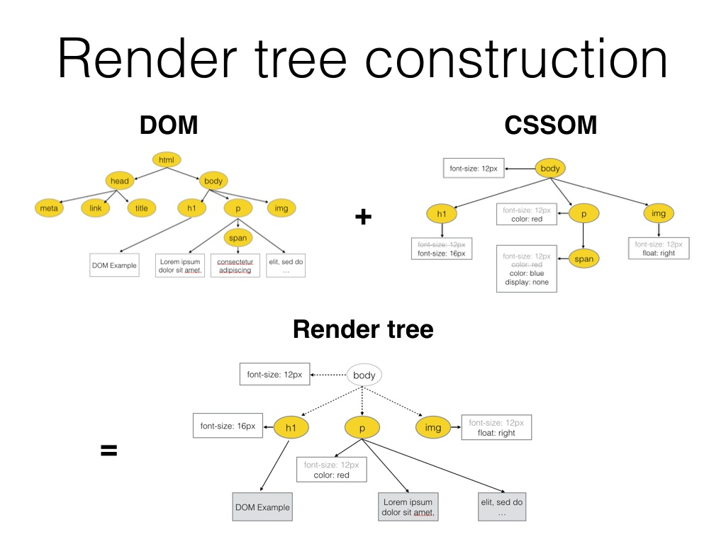 렌더링 엔진은 HTML 문서를 파싱하고 "콘텐츠 트리" 내부에서 태그를 DOM 노드로 변환한다. 그 다음 외부 CSS 파일과 함께 포함된 스타일 요소도 파싱한다. 스타일 정보 HTML 표시 규칙은 "렌더 트리"라고 부르는 또 다른 트리를 생성한다.