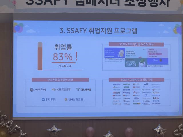 컨설턴트님의 강연과 함께 마지막에는 두 SSAFY 수료생분들의 인터뷰도 들었는데, 8기 수료생 두 분은 모두 비전공자 출신으로 SSAFY를 어떻게 수료했고, 어떻게 취업을 하셨는지 알려주셨는데 제일 집중해서 들었던 부분 같아요!